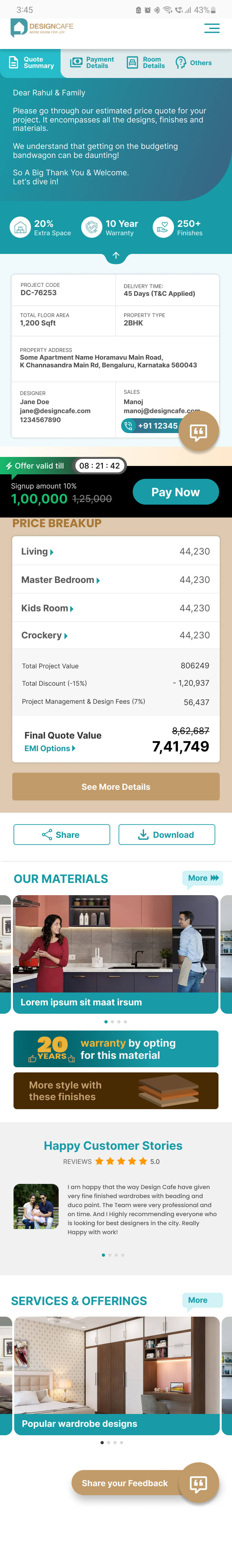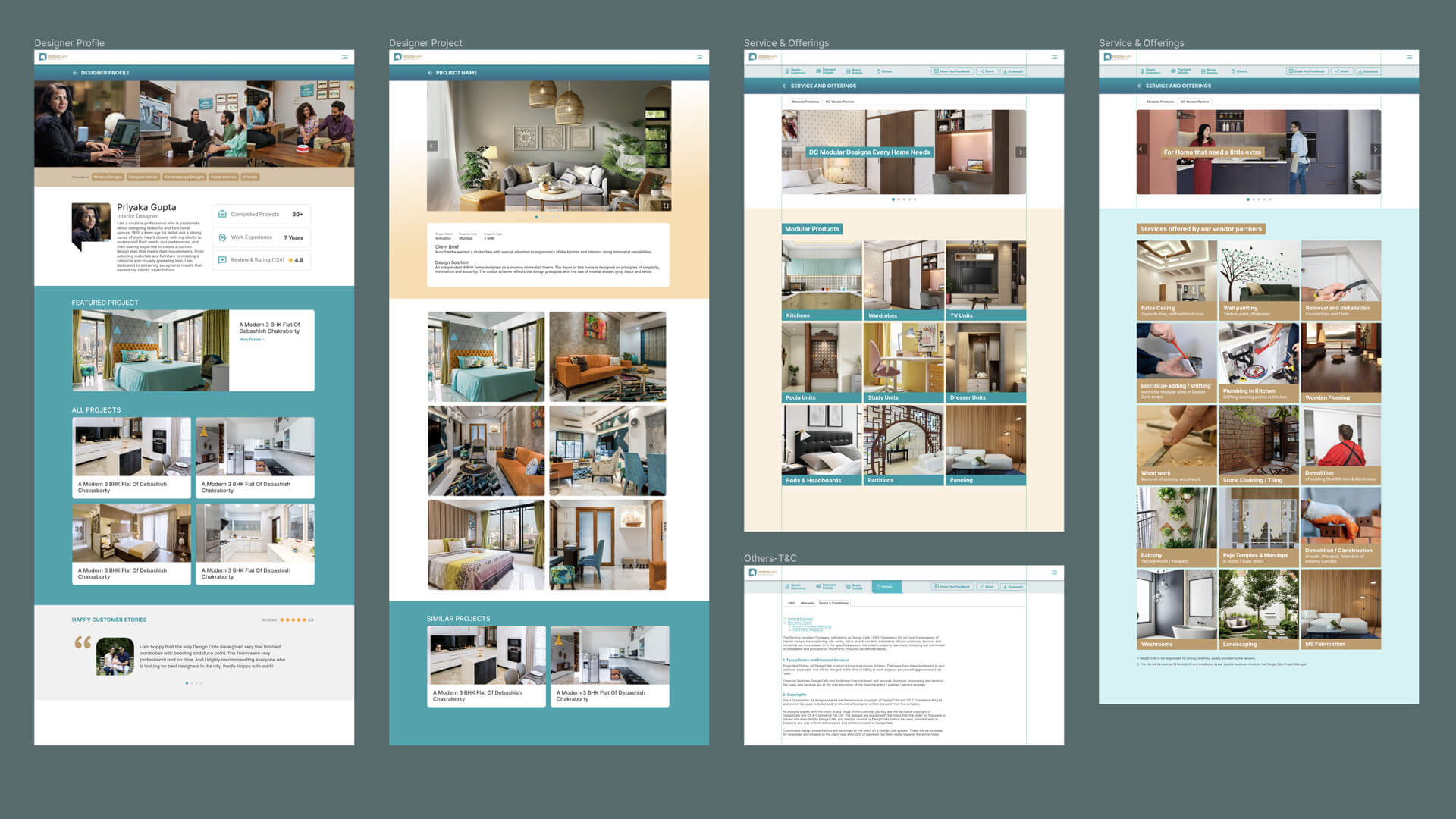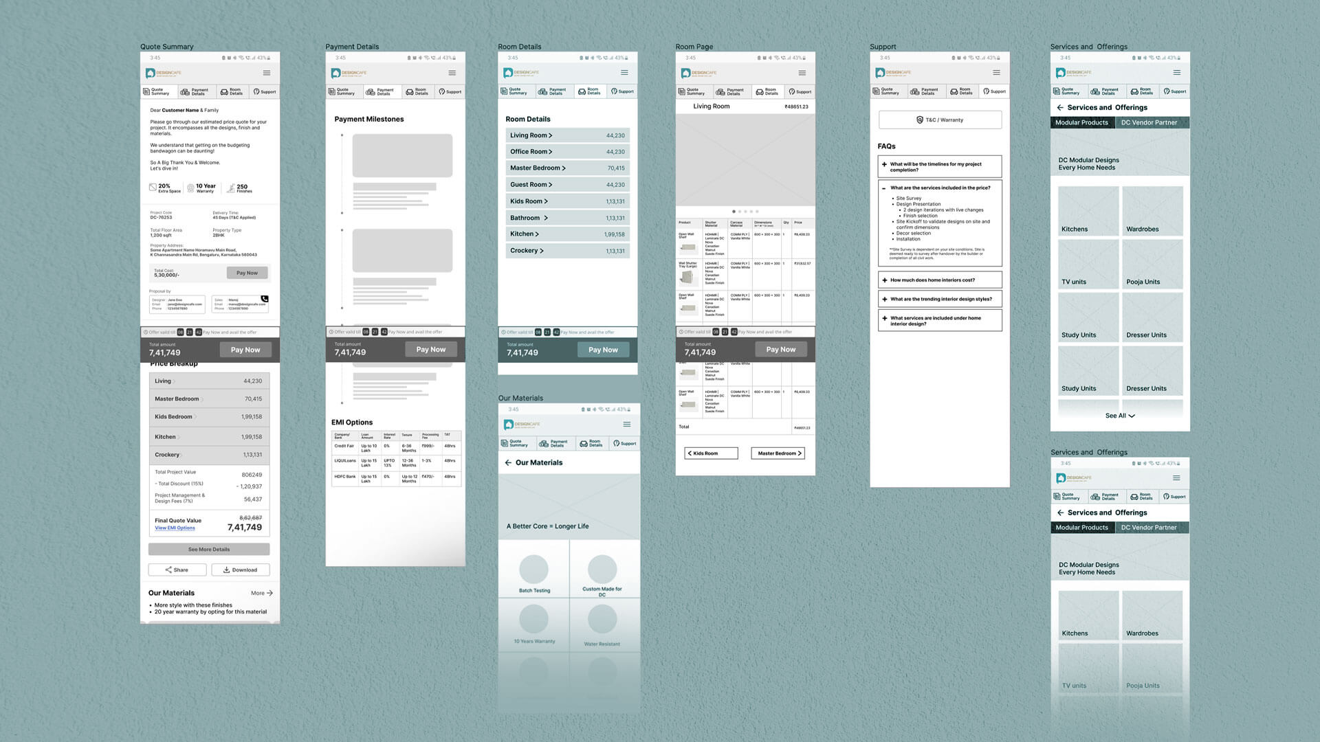 This wireframe ensures a user-friendly experience, empowering customers to understand, customize, and seamlessly proceed with the interior design quoting process while having access to relevant supporting details.